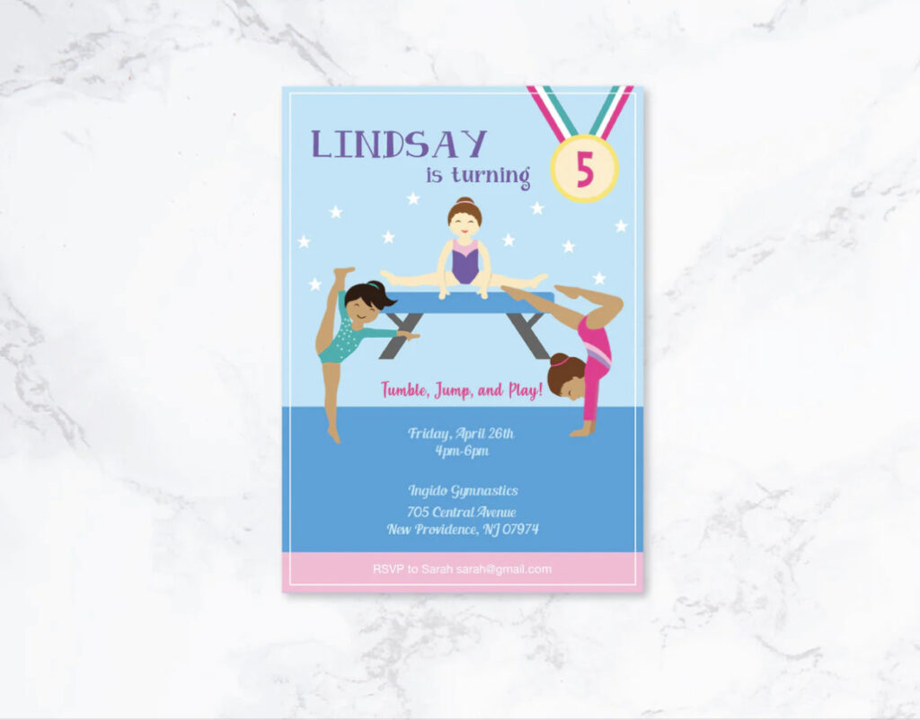 Get your guests excited about your gymnastic party with a gymnastic birthday party invitation that will set the tone to your celebration. If you are hosting your gymnastic party at a gymnastics facility, be sure to include all the necessary information, such as attire for tumbling and the gymnastics birthday party liability waiver the parents need to sign in advance or when they arrive at the facility.