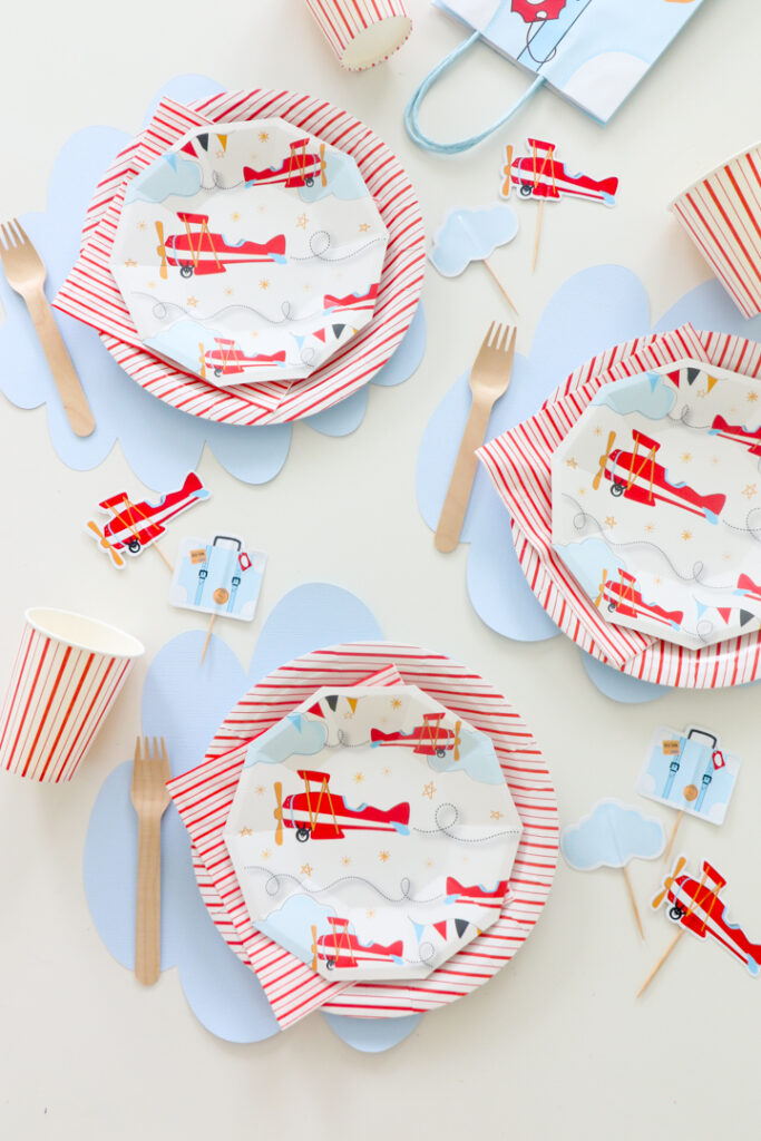 Pair adorable airplane and striped paper plates to make your airplane themed party tablescape extra fun. Complement each table setting with wooden utensils, cups, napkins and DIY cloud placemats.