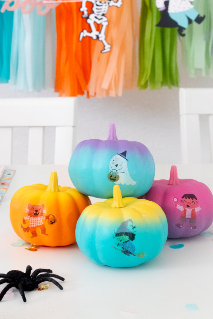 You can use your DIY monster mash tattoo pumpkin decorations as table centerpieces and incorporate tall candles to add height and interesting visuals to your party set up. Party confetti and glittered spiders are wonderful to add a not-so-spooky feel to your celebration.